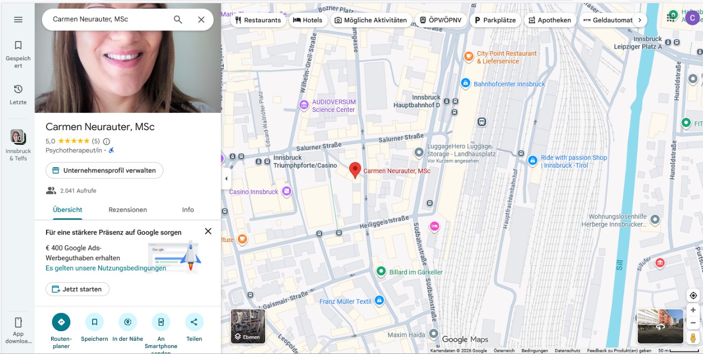 Mit dem Routenplaner finden Sie leicht zu mir. Verwenden Sie bitte die Türklingel, mit der Beschriftung, PRAXISGEMEINSCHAFT, Top9 Wenn Sie durch die zwei Türen des Hauseingangs gegangen sind, dann kommen Sie rechts über die Treppe, oder dem Lift, in den 2. Stock. Dort angekommen, die erste Tür Links, mit dem Schild „Praxisgemeinschaft Top 9“. Bitte kommen Sie pünktlich und nicht zu früh! Die Termine sind getaktet, damit möglichst wenig Kontakt mit anderen Klienten*innen entsteht, um die Privatsphäre aller zu ermöglichen. Anfahrt mit öffentlichem Verkehrsmittel: Haltestellen für den Bus: Zu Fuß ist die Praxis nicht weit vom Zentrum bzw. Hauptbahnhof entfernt. Telefonische Notfallkontakte: